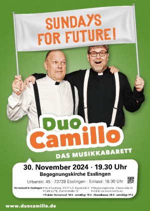 Freitags demonstrieren kann jeder. Echte Helden springen sonntags von der Memory-Schaum-Matratze, weil sie wissen: „Man kann nur retten, was man liebt.“ Und um sich in die Schöpfung, das Leben und die Sellerie-Baiser-Torte von Oma neu zu verlieben, dafür ist der Sonntag nun mal der perfekte Tag. Wenn nur die Grenze zwischen Liturgie und Lethargie nicht so fließend wäre. Höchste Zeit, wieder mehr sonntägliche Ekstase zu wagen. Die Verbalakrobaten von Duo Camillo machen Musikkabarett vom Feinsten und zeigen auf höchst unterhaltsame Weise, warum „Glaube, Liebe und Hoffnung“ nach wie vor das perfekte Fundament für echtes Change-Management sind. Martin Schultheiß und Fabian Vogt sind inzwischen seit 33 Jahren gemeinsam als Musikkabarettisten unterwegs – und ihre Lust am hemmungslosen Improvisieren ist legendär; ganz egal, an welchem Wochentag.
