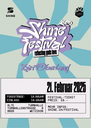 Am 21. Februar 2025 ist es soweit. Das SHINE Festival kommt ins Züri Oberland! Mit dabei sind JackSayFree, Keri, ND Light und Jay Miller. Wir freuen uns auf einen Abend voller Musik, Inspiration, feinem Food und Gemeinschaft mit Jugendlichen aus der Region. Bring deine Freunde mit!