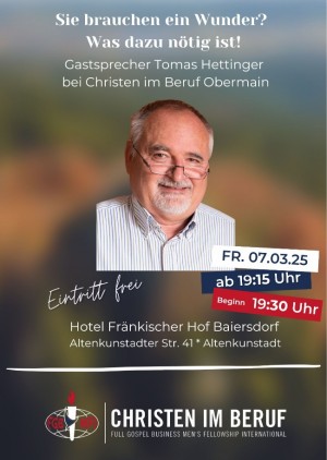 Thomas Hettinger ist (Mit-) Geschäftsführer zweier christlicher Unternehmen. Daneben ist er Vorstand einer gemeinnützigen Stiftung, die sich in der christlichen Medienarbeit engagiert und humanitäre Hilfe in Drittländern und Katastrophengebieten leistet. Er wird gemeinsam mit seiner Frau davon berichten, wie sich Situationen teilweise schlagartig durch Gebet geändert haben. Sie erlebten, wie sich aussichtslose Situationen nach Gebet wandelten: Kranke wurden geheilt, Beziehungen wiederhergestellt, wie aus Feinden Freunde wurden und wirtschaftliche Probleme sich gelöst haben.
