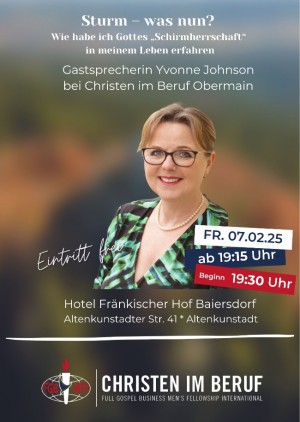 Yvonne Johnson, war die meiste Zeit Ihres Lebens alleinerziehend und leitet heute Ihr eigenes Unternehmen. Als älteste Tochter musste Sie bereits früh Verantwortung für Ihre drei Geschwister übernehmen. Zielstrebigkeit, Fleiß und Verantwortungsbewusstsein haben sehr zu Ihrer beruflichen Karriere, als sehr erfolgreiche, weltweit anerkannte Führungskraft in der Pharma- u. Medizinbranche beigetragen. Trotzdem gab es Situationen, in denen die „Stürme des Lebens“ ihr sehr zugesetzt haben. Wie hat Gott in ihr Leben eingegriffen? Wie hat Sie Gottes Hilfe in diesen Zeiten erlebt? Mutmachende Geschichten, nicht nur für alleinerziehende Mütter….