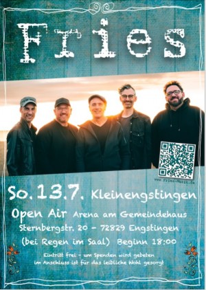 Die Band FRIES spielt eigene Singer-Songwriter-Rocksongs mit leichten Country-Einflüssen und deutschsprachigen Texten, die allesamt reif, gelassen und positiv klingen. Mal humorvoll mal nachdenklich und unabhängig vom Zeitgeist. Sie schlüpfen raffiniert in Hirn und Herz und richten dort allerhand an. Aber keinen Schaden. Sie kommen mit ungekünstelter, alltäglicher Sprache und berührenden Geschichten daher und schaffen es mühelos, einen Bogen von der Generation Streaming bis zur Generation Testbild zu spannen. Nicht verlieben, verlassen, vermissen, sondern bleiben, weitermachen - und ernsthaft Spaß am Leben haben, auch wenn die eine oder andere Illusion vielleicht schon etwas blasser geworden ist. Obwohl die Band mit dem ersten Album (Das Leben nach dem Happyend) eben erst loslegt, merkt man den 5 routinierten Jungs (mit Ex-SCHULZE-Sänger Frieder Sigloch) sofort an, dass sie nicht zum ersten Mal auf einer Bühne stehen und sich dort immer noch sichtlich zu Hause fühlen.
