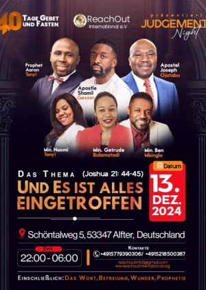 Apostel Shamil Gesser (Niederlande), Apostel Joseph Ojatabu, Prophet Aaron und viele andere gesalbte Diener werden anwesend sein, um allen zu dienen, die Gottes Berührung und Eingreifen benötigen. Wir sind zuversichtlich, dass wir nach dieser Veranstaltung nicht mehr dieselben sein werden und das Jahr 2024 nicht mit unerfüllten Verheißungen beenden.