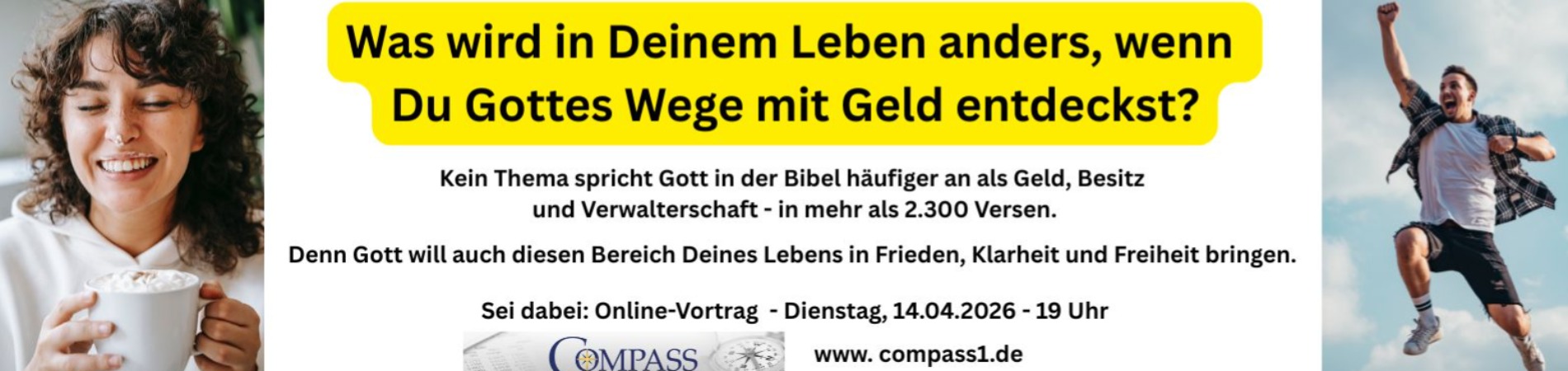 Viele Menschen leben in finanzieller Unsicherheit: Schulden, Stress, Konflikte. Doch GOTT hat einen besseren Weg. Die Bibel spricht intensiv über Geld – und zeigt Prinzipien, die seit Jahrhunderten tragen. COMPASS macht diese Prinzipien erlebbar: Du gewinnst Klarheit, triffst gute Entscheidungen und erlebst echte Freiheit und Frieden – für Dich, Deine Familie, Deine Gemeinde und Deine Zukunft.