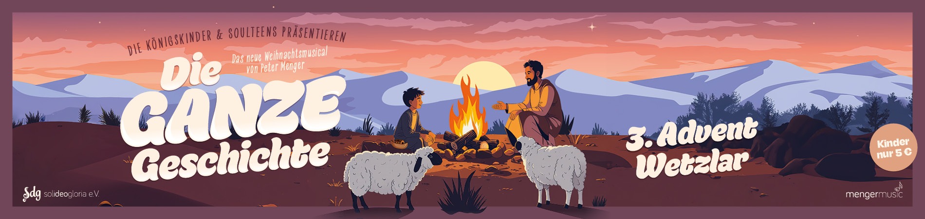 Am 3. Advent führt der Kinderchor »Königskinder Hüttenberg« gemeinsam mit den »Soulteens Mittelhessen« unter der Leitung von Deborah Menger das neue Kinder-Weihnachtsmusical »Die ganze Geschichte« von Peter Menger das erste Mal auf. Herzliche Einladung!