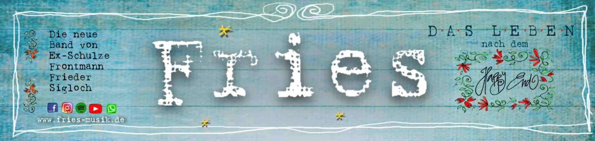 Die Band FRIES spielt eigene Singer-Songwriter-Rocksongs mit leichten Country-Einflüssen und deutschsprachigen Texten, die allesamt reif, gelassen und positiv klingen. Mal humorvoll mal nachdenklich und unabhängig vom Zeitgeist. Sie schlüpfen raffiniert in Hirn und Herz und richten dort allerhand an. Aber keinen Schaden. Sie kommen mit ungekünstelter, alltäglicher Sprache und berührenden Geschichten daher und schaffen es mühelos, einen Bogen von der Generation Streaming bis zur Generation Testbild zu spannen. Nicht verlieben, verlassen, vermissen, sondern bleiben, weitermachen - und ernsthaft Spaß am Leben haben, auch wenn die eine oder andere Illusion vielleicht schon etwas blasser geworden ist. Obwohl die Band mit dem ersten Album (Das Leben nach dem Happyend) eben erst loslegt, merkt man den 5 routinierten Jungs (mit Ex-SCHULZE-Sänger Frieder Sigloch) sofort an, dass sie nicht zum ersten Mal auf einer Bühne stehen und sich dort immer noch sichtlich zu Hause fühlen.
