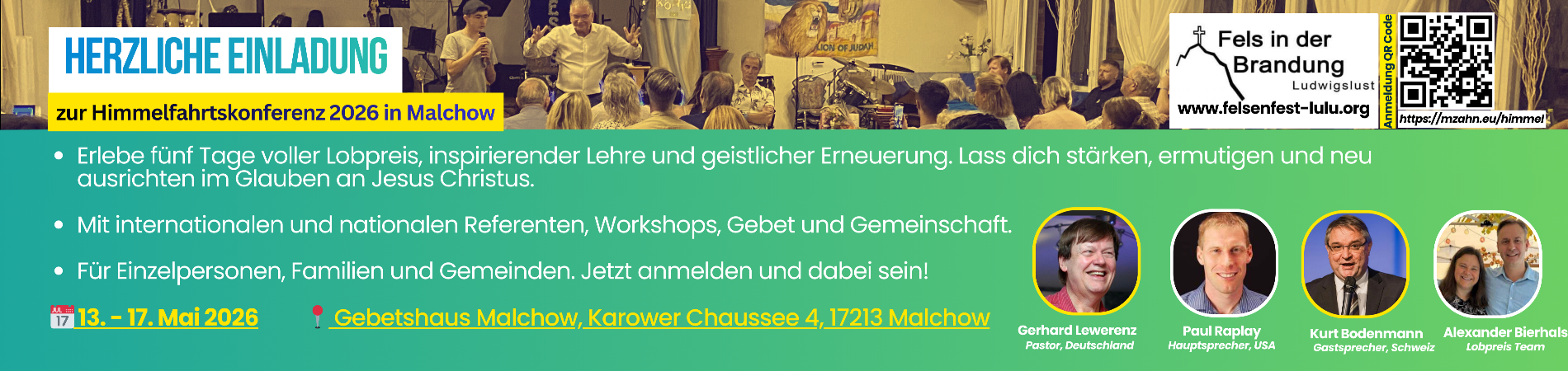 Die Himmelfahrtskonferenz 2026 in Malchow lädt ein zu Tagen voller Lobpreis, Lehre und geistlicher Erneuerung. Unter dem Motto „Wachet, steht im Glauben. Seid mutig und seid stark!“ erleben Teilnehmende Gemeinschaft, Inspiration und neue Kraft im Glauben.