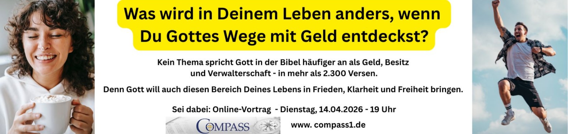 Viele Menschen leben in finanzieller Unsicherheit: Schulden, Stress, Konflikte. Doch GOTT hat einen besseren Weg. Die Bibel spricht intensiv über Geld – und zeigt Prinzipien, die seit Jahrhunderten tragen. COMPASS macht diese Prinzipien erlebbar: Du gewinnst Klarheit, triffst gute Entscheidungen und erlebst echte Freiheit und Frieden – für Dich, Deine Familie, Deine Gemeinde und Deine Zukunft.