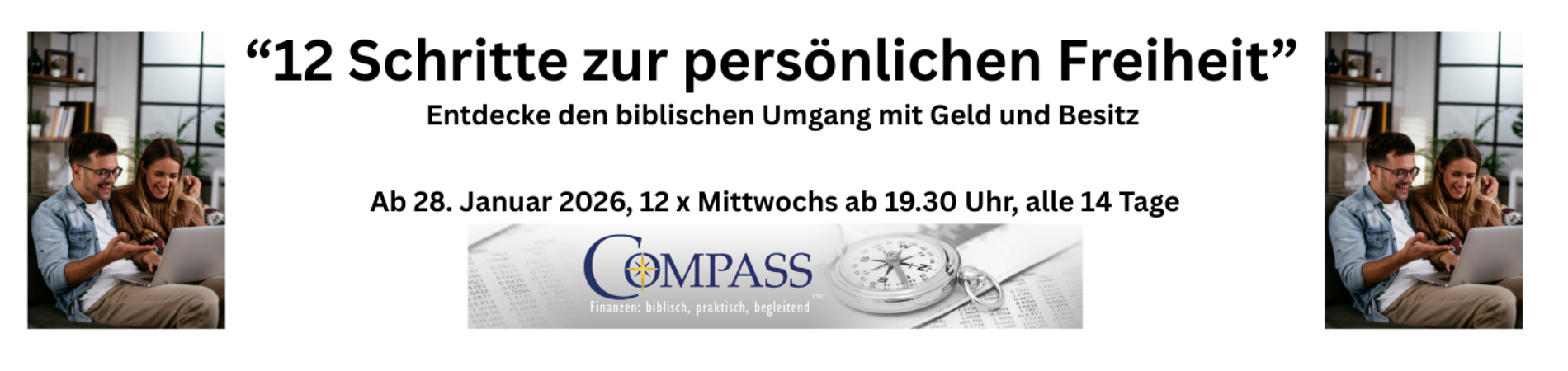 Viele Menschen leben in finanzieller Unsicherheit: Schulden, Stress, Konflikte. Doch GOTT hat einen besseren Weg. Die Bibel spricht intensiv über Geld – und zeigt Prinzipien, die seit Jahrhunderten tragen. COMPASS macht diese Prinzipien erlebbar: Du gewinnst Klarheit, triffst gute Entscheidungen und erlebst echte Freiheit und Frieden – für Dich, Deine Familie, Deine Gemeinde und Deine Zukunft.