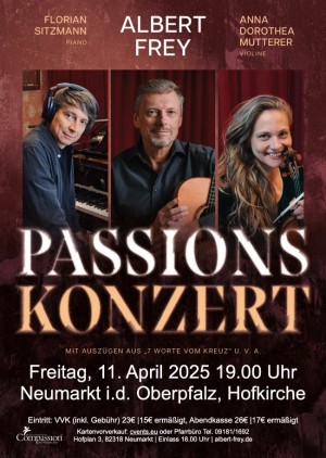 Das „Passions-Konzert“ mit Albert Frey, der angehenden Star-Violinistin Anna Dorothea Mutterer und dem Meister-Pianisten Florian Sitzmann (Söhne Mannheims u.v.a.) ist ein Pop-Programm mit klassischem Touch. Neben Auszügen aus dem Projekt „7 Worte vom Kreuz“ kommen weitere Songs zum Mitsingen, aber auch persönliche Lieder und Themen sowie Instrumentalstücke zum Klingen. Sie loten die Bedeutung der Passionszeit für uns heute aus, tiefgehend, berührend, lebensbejahend.