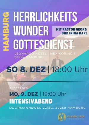 Die Pastoren Georg & Irina Karl sind Leiter des Glory Life Netzwerkes und von Glory Harvest International und erleben seit einigen Jahren in ihren Versammlungen einen permanent offenen Himmel, unter dem spektakuläre Wunder aller Art in großer Zahl die Verkündigung des Wortes Gottes begleiten, sodass Menschen dauerhaft geistlich, seelisch und körperlich verwandelt werden und ihren Platz als Söhne und Töchter Gottes einnehmen. Pastor Georg ist außerdem Autor von „Reise in die Herrlichkeit“ und drei weiteren weit verbreiteten Büchern.