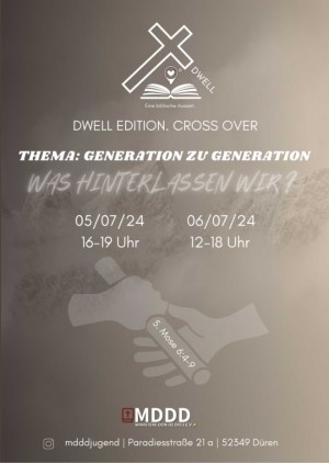 Was hinterlassen wir ? Das ist die Frage hinter dieser Edition von DWELL angelehnt an 5. Mose 6:4-9. Ob im familiären, sozialen, geistlichen oder materiellen Kontext - ein Generation prägt die nächste Generation der Menschheit und hinterlässt ein Erbe. Was werden wir Christen hinterlassen? Am Fr, 05.07 (16 -19 Uhr) und Sa, 06.07 ( 12-18 Uhr inkl. Mittagspause) wollen wir mit euch gemeinsam, dieser Thematik anhand der Bibel auf dem Grund gehen.