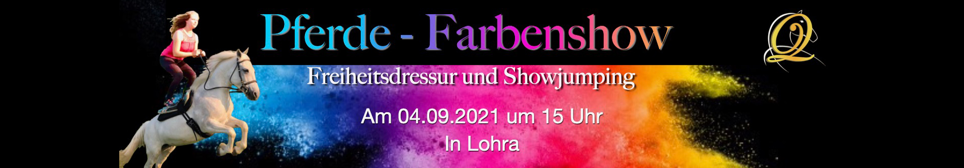 Bei unserer diesjährigen Pferdefarbenshow präsentieren wir euch die unterschiedlichsten Pferde und machen uns in einer spannenden Geschichte gemeinsam auf den Weg der Farben. Mit spektakulären Lektionen, sowohl in der Freiheitsdressur, als auch im Sattel, entsteht ein aufregendes Erlebnis für die ganze Familie.