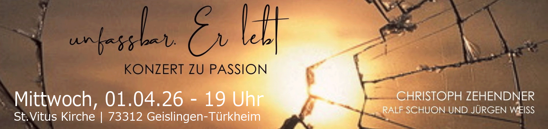 Vertraute und neue Lieder aus der Feder von Christoph Zehendner sowie Kompositionen von Ralf Schuon (u. a. aus dem Album „Unfassbar – Musikalische Fenster ins Markus-Evangelium“) verbinden sich mit bewegenden Texten und warmen Instrumentalklängen. So entsteht ein Abend, der Raum lässt für eigene Gedanken zu Passion und Auferstehung und der gleichzeitig zum Mitsingen einlädt.