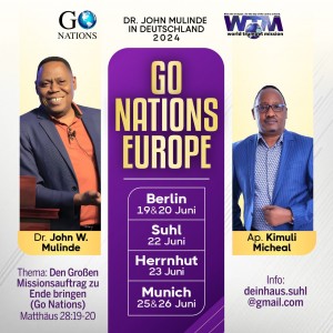 Dr. John Mulinde hat seit 1998 maßgeblich die Gebetsbewegung in Deutschland und anderen Nationen vorangebracht, stets die Wichtigkeit von Einheit in Gottes Absichten als Leib Christi betont und er hat über die letzten Jahre immer wieder viele Gebetsmissionare aus Uganda nach Deutschland und in andere Länder gesendet. Nach über 10 Jahren kommt er zurück nach Deutschland mit einer prophetischen Botschaft namens "GO NATIONS", die Gott ihm für diese Zeit und die Nationen anvertraut hat. Er arbeitet daran, eine globale Bewegung im Leib Christi zu mobilisieren, um den großen Missionsauftrag von Jesus innerhalb dieser Generation zu erfüllen.