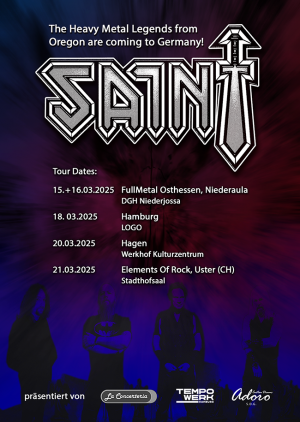 Die White Metal Band Saint aus Salem, Oregon (USA) ist eine Legende: In 1984 gegründet, feierten sie jüngst ihr 40-jähriges Bandjubiläum. In 2024 veröffentlichten sie ihr zwölftes Studioalbum „Immortalizer“. Ihre Qualitäten haben sich über die Jahre dabei nie geändert. Seit jeher stehen Saint für puren, klassischen Metal mit ungeschliffenen Kanten, intensiven Riffs und einem kraftvollen, kompromisslosen Sound, der jedes Metallerherz höher schlagen lässt. Ihre Texte handeln u.a. von Erlösung, Beharrlichkeit und von dem rauen menschlichen Geist, den jeder in sich trägt. Erwarte donnernde Drums, in Höhen abhebende Vocals und Gitarrensoli, die gefangen nehmen und so im Ohr hängen bleiben, dass jeder Zuhörer mehr möchte. Mach dich bereit weg gepustet zu werden durch die pure, ungefilterte Metalpower, die nur Saint liefern kann. Saint treten an mit Gründungsmitglied Richard Lynch am Bass, Matthew P. Smith an den Gitarren, Jared Knowland am Schlagzeug und an den Lead Vocals Eli Prinsen (The Sacrificed, Dream Patrol), der auch schon für Sacred Warrior, Deliverance, Signum Regis, Aldaria, Sceptre, Sealed Fate und viele andere am Mikro stand.