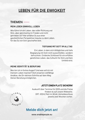 Es erwarten Dich abwechslungsreiche Tage mit Impulsvorträgen, interaktiven Gemeinschafts- und Reflexionszeiten. Zur nachhaltigen und motivierenden Stärkung von Christen im Alltag.
