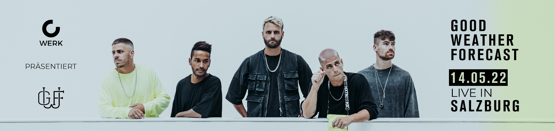 Die drei Brüder Flo, Jonny und Dave und Freund Timo haben ihr Zuhause, die Bühnen dieser Welt, schon lange gefunden: Bis heute können Good Weather Forecast mehrere hundert Gigs in 17 Ländern und vier Kontinenten auf ihrem Konto verbuchen. Doch eines hat sich nicht eingeschlichen: Routine. Jeder Gig wird gespielt, als wäre es der Erste. Oder der Letzte. Jede Show ist besonders. Das macht Good Weather Forecast zu einer außergewöhnlichen und authentischen Live-Band, bei der man sich auf ein ganz besonderes Energie geladenes Konzert Erlebnis freuen darf.
